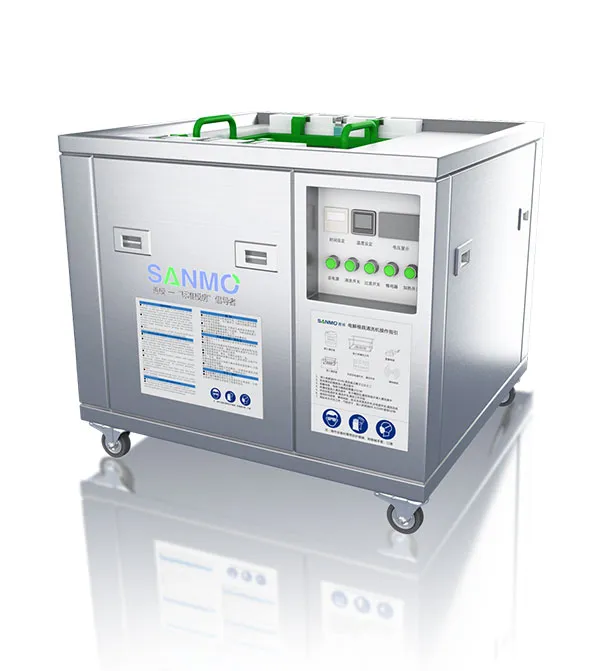 Shanmo's electrolytic mold cleaning machine combines the advantages of electrolysis and ultrasound. The mold is placed at the bottom of the cleaning basket, in contact with the negative electrode. Hydrogen molecules in the electrolyte gather from the positive electrode to the negative electrode. Because hydrogen molecules are the smallest molecules, they can penetrate the dirt adhering to the mold. When electrolysis begins, the hydrogen molecules electrolyze into hydrogen gas, which expands and pushes off the dirt from the mold surface.